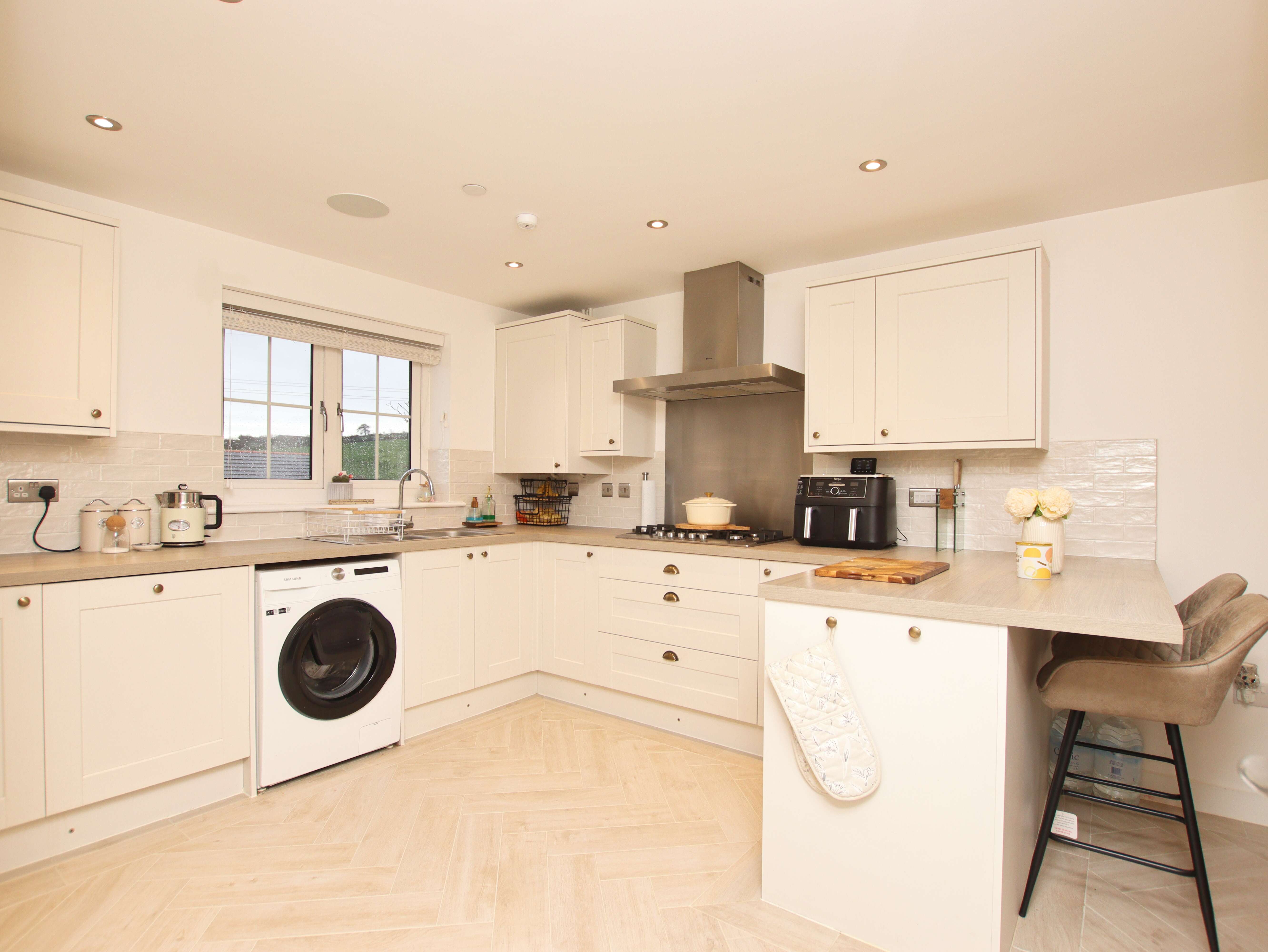 Completing the ground floor is a modern open-plan kitchen/diner, boasting ample storage units, a breakfast bar, herringbone flooring, and dual-aspect windows that flood the space with natural light—perfect for family living and entertaining.
