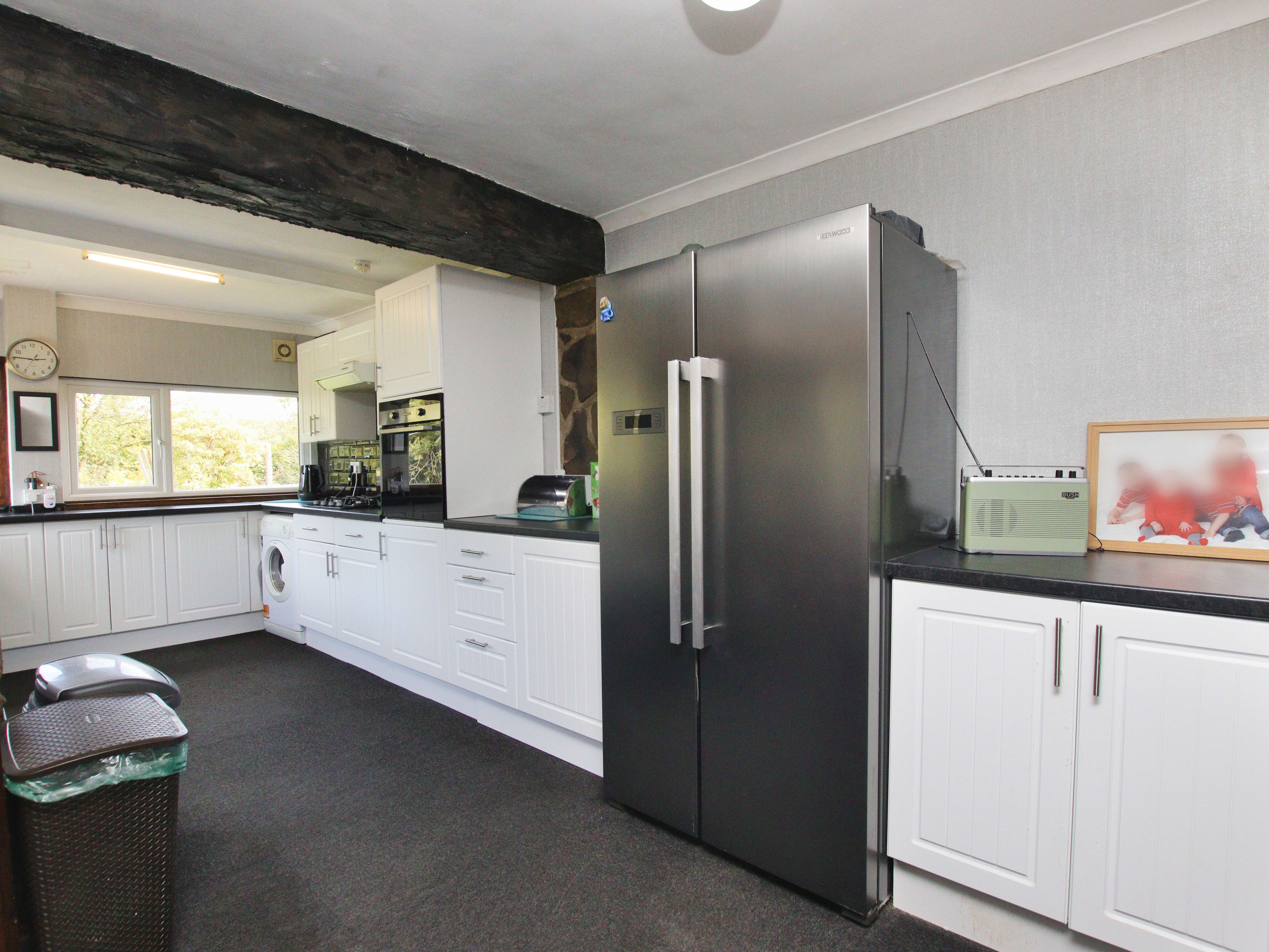 On the ground floor, the property features an entrance hallway with access to a convenient WC. A generous lounge sits to the front of the home, complete with a carpeted floor and a characterful fireplace. From here, an archway leads into the open-plan kitchen/dining room. The kitchen provides ample base units and includes an integrated oven, hob and extractor hood. The dining area is enhanced by a feature fireplace and French doors that open directly onto the rear garden, creating a perfect space for both everyday living and entertaining.
