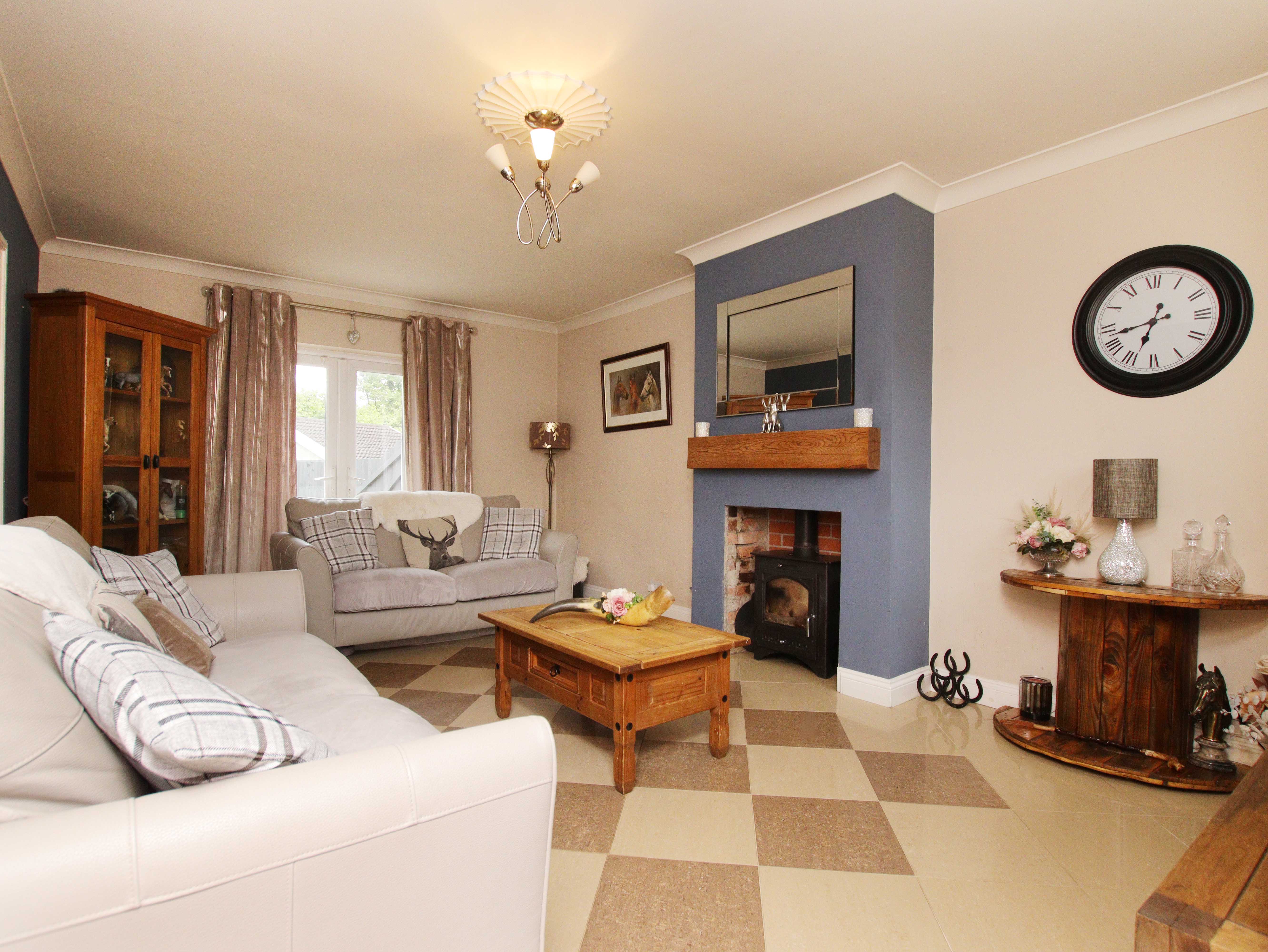 Upon entering the property, you are welcomed by an entrance porch that leads into a bright and spacious lounge. The lounge features a charming fireplace, underfloor heating and French doors that open out to the rear garden, allowing natural light to flood the space. Also on the ground floor is a large kitchen/diner, fitted with ample wall and base units, ceramic tiled flooring, and integrated appliances including an oven, hob, and extractor hood.