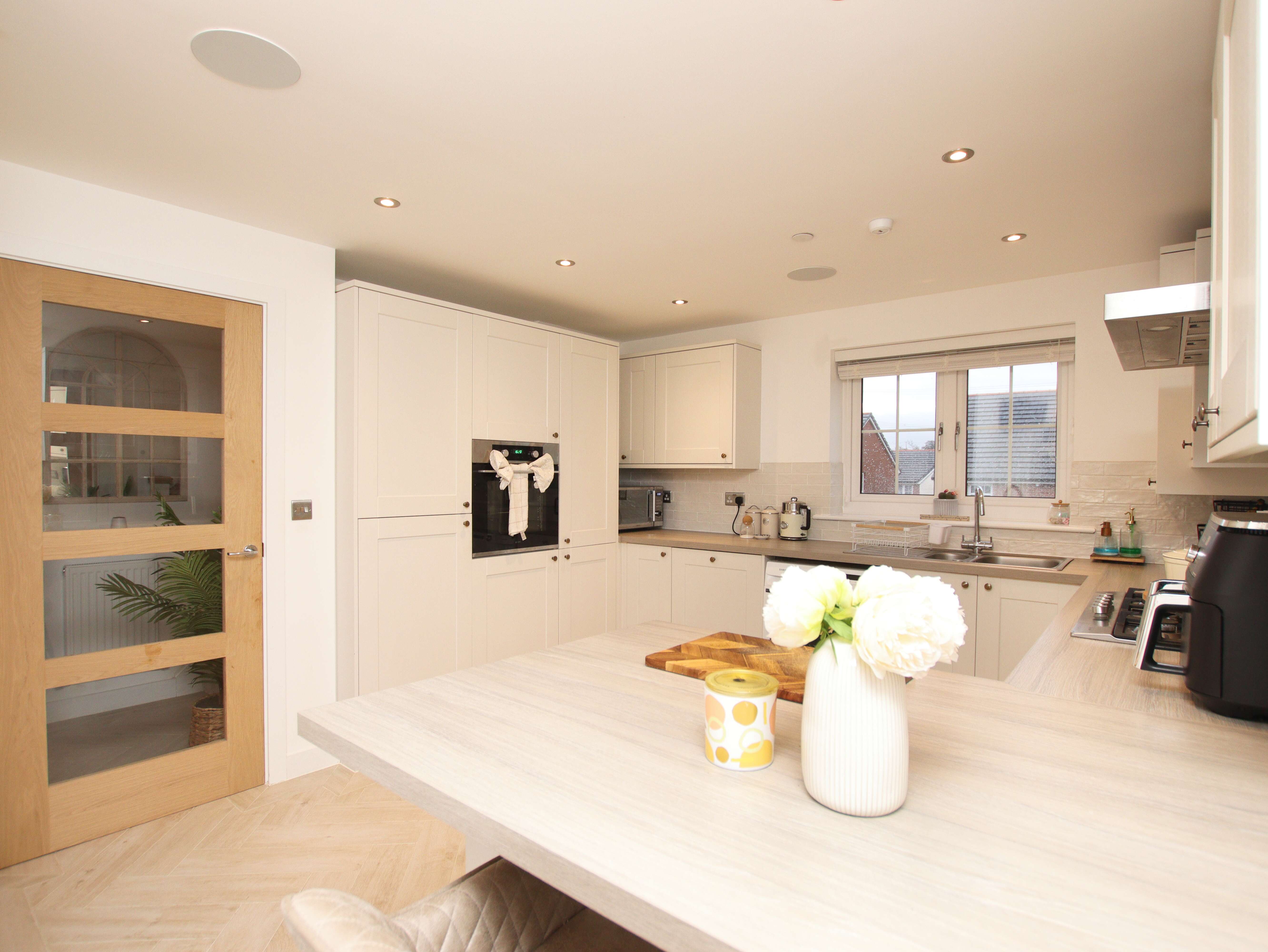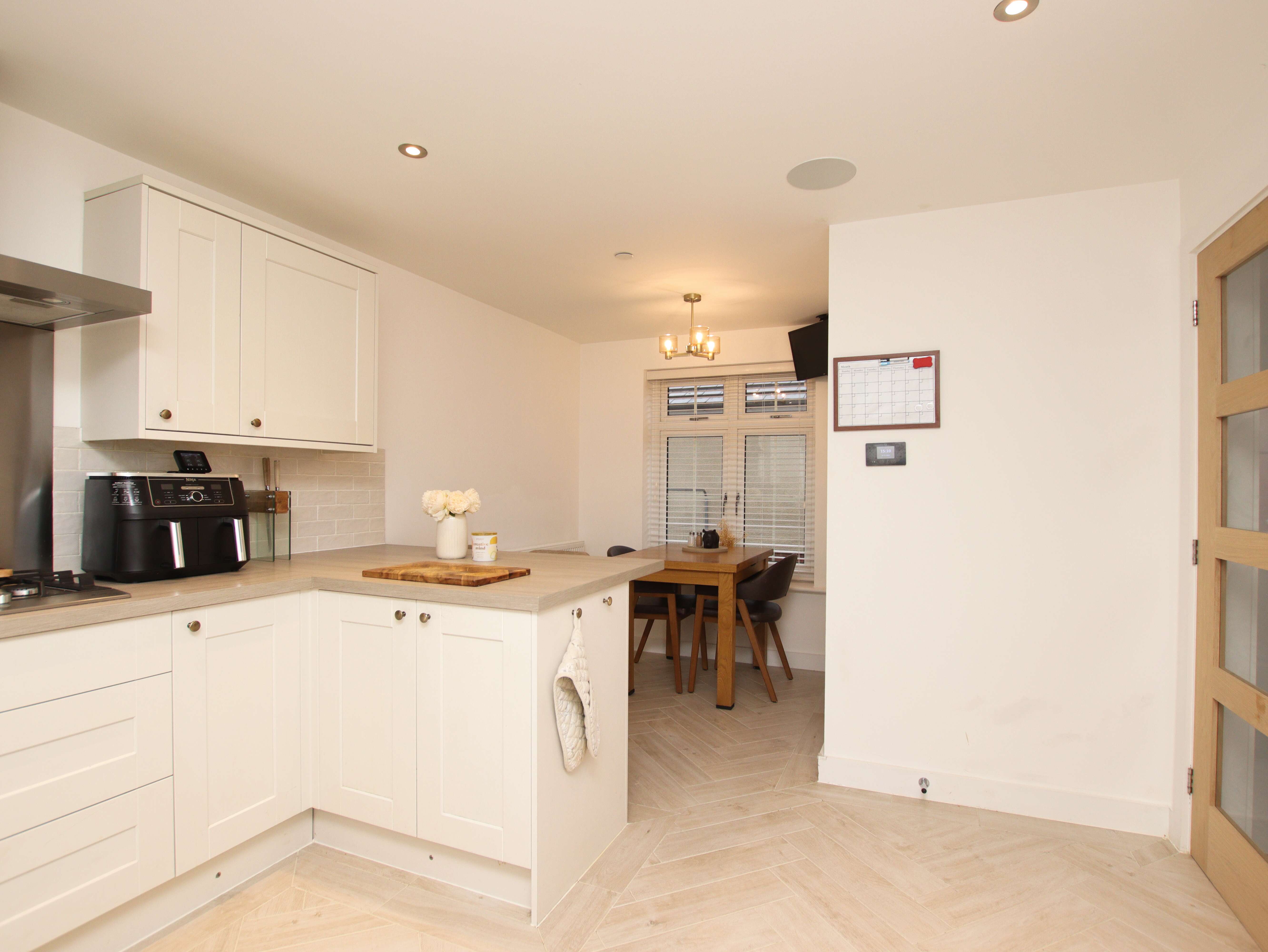 Completing the ground floor is a modern open-plan kitchen/diner, boasting ample storage units, a breakfast bar, herringbone flooring, and dual-aspect windows that flood the space with natural light—perfect for family living and entertaining.