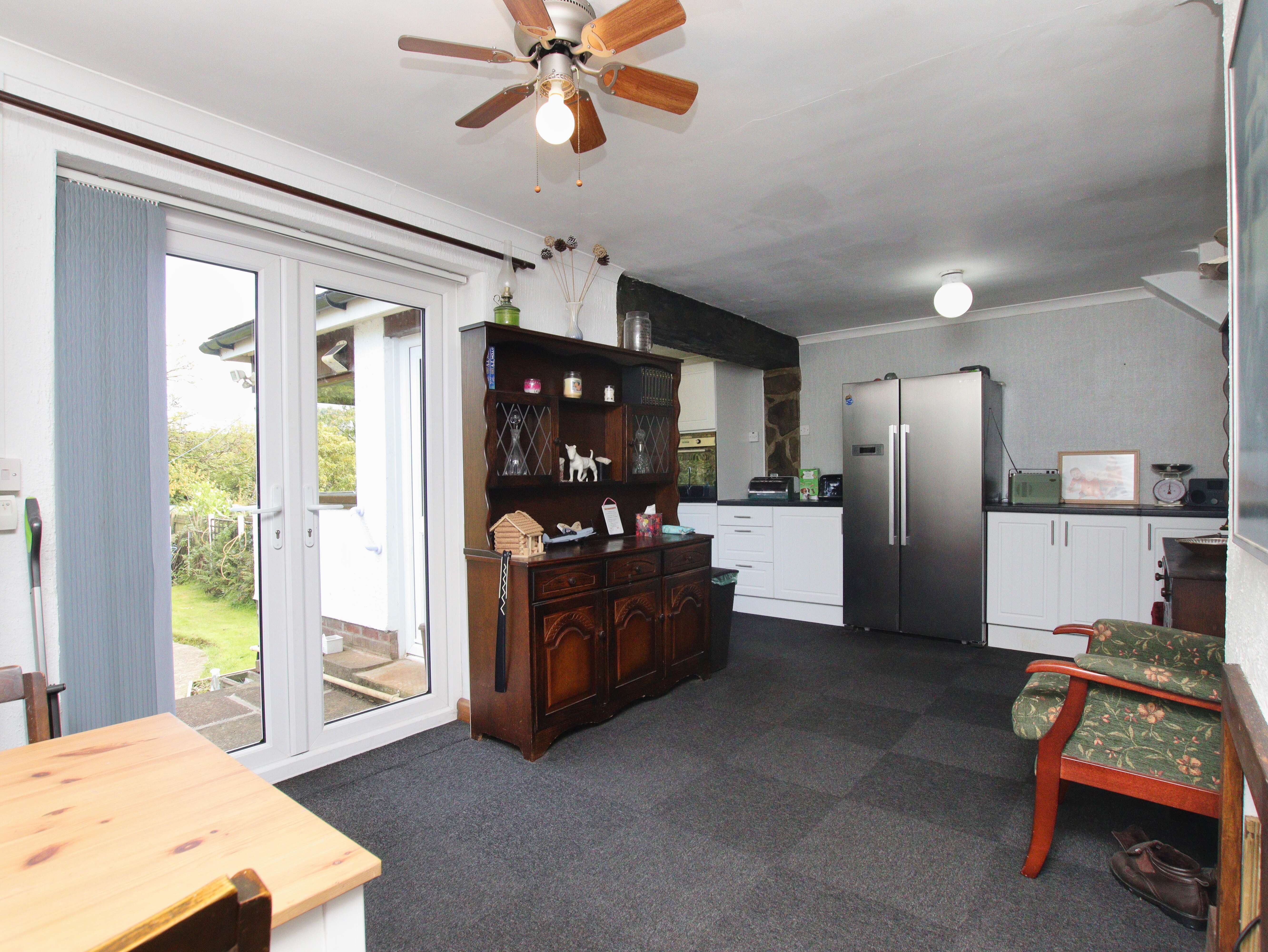 On the ground floor, the property features an entrance hallway with access to a convenient WC. A generous lounge sits to the front of the home, complete with a carpeted floor and a characterful fireplace. From here, an archway leads into the open-plan kitchen/dining room. The kitchen provides ample base units and includes an integrated oven, hob and extractor hood. The dining area is enhanced by a feature fireplace and French doors that open directly onto the rear garden, creating a perfect space for both everyday living and entertaining.